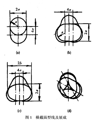 偏心距e,節(jié)距t,雙頭。C型轉(zhuǎn)子截形是類橢圓,其直徑D=2a,偏心距e,大半徑b=a+2e,節(jié)距t,雙頭。