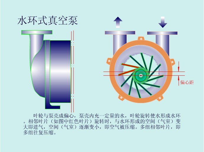 水環式真空泵圓柱形泵缸內注入一定量的水,星形葉輪偏心地裝在泵缸內,當葉輪旋轉時,水受離心力作用被甩向四周而形成一個相對于葉輪為偏心的封閉水環!