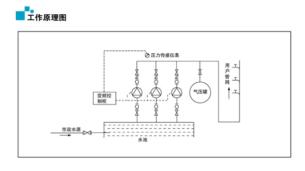 根據用戶要求,先設定給水壓力值,然后通電運行,壓力傳感器監測管網壓力,并轉為電信號送至可編程控制器或微機控制器,經分析處理,將信號傳至變頻器來控制水泵運行,當用水量增加時,其輸出的電壓及頻率升高,水泵轉數升高,出水量增加,當水量減小時,水泵轉數降低,減少出水量,使管網壓力維持設定壓力值,,在多臺泵運行時,逐機軟啟動,由變頻轉工頻至壓力流量滿足為止,實現了水泵的循環控制,當夜間小流量運行時,可通過變頻水泵來維持工作,變頻給水泵可以停機保壓。