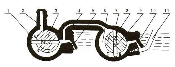 5、圖1是旋片式真空泵泵原理圖,轉子3及7與高真空室外1及低真空室6相切,轉子3及7沿箭頭方向旋轉,帶動轉子槽內滑動的轉片旋轉,由于彈簧9及離心力的作用, 轉片外端緊貼高低真空室的內表面滑動,把轉子與高低真空室所形成的月洼形空間從進氣嘴2到排氣閥門5和從過氣管4到排氣閥門10之間分隔開來,形成二或三個容積,并且周期性的大小變化,當在圖示旋片式真空泵位置繼續旋轉時A及C容積逐漸增大,被抽容積氣體沒進氣嘴進入泵內,同時B及D容積逐漸減少,壓力升高,隨后沖開排氣閥門5及10,將氣體排出真空室外,氣體經過油面而排于大氣之中,因為油是淹住排氣門的,故能防止氣體返回真空室。當抽氣壓強較高時,高低真空室的閥門都排氣,相當于單級泵,當真空度較高時,全部氣體進入真空室,再由排氣閥門10排出,此時二級串聯即進入雙級泵工作。
