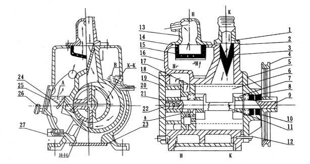 在2X旋片式真空泵體內壓入一個中隔板、將真空泵殼分成高低真空室,各室都有排氣門,高真空室排氣與低真空氣相通。高轉子前端伸出前軸;后端伸出后軸。前軸通過前端板的軸承支持、經過油密封室而伸出前端板外:后軸由中隔板上的軸承支持。而伸入低真空室內,低真空室轉子則裝在后軸上、故高低轉子均由前軸帶動。高低轉子都有對開的槽子,呈“T”形的旋片由彈簧支撐開而裝于槽內。2X旋片式真空泵的進氣口處有過濾網,而排氣口處有擋油網,視鏡左邊有摻氣閥,下邊有放油塞。