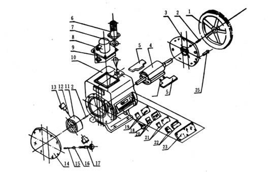 6、2X系列的各種真空泵的外形和結構是基本相同的,泵由電機經三角皮帶傳動到轉子。電動機和泵用螺釘卡板固定在底盤上。